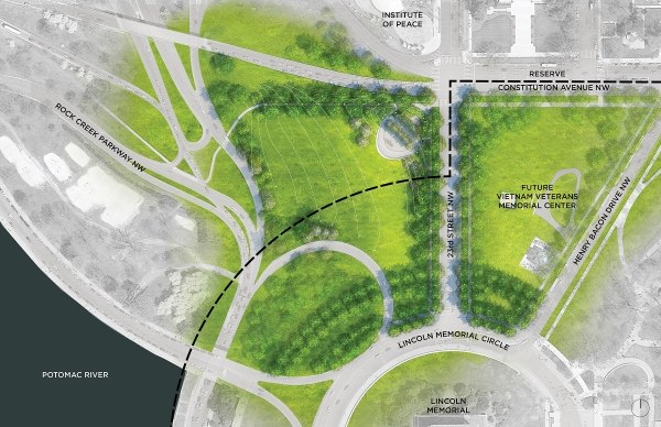 Map showing the future site of the National Desert Storm War Memorial, on 23rd Street NW and Constitution Avenue NW near the National Mall. (OLIN Studio/CSO Architects)